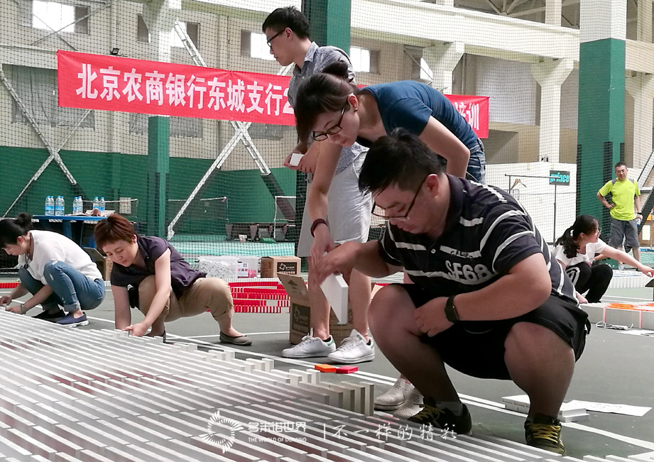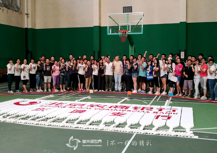 隨后的團體挑戰(zhàn)項目,四支隊伍共同完成了一幅多米諾畫卷,畫卷上既有代表四支隊伍的四色小人,又有“厚德、益眾、善行、致遠(yuǎn)”的企業(yè)精神,還有寓意著團結(jié)、力量的拳頭圖案,在一道靚麗的彩虹下,巨幅的北京農(nóng)商行東城支行LOGO畫面,憧憬著北京農(nóng)商行彩虹般美好的未來。