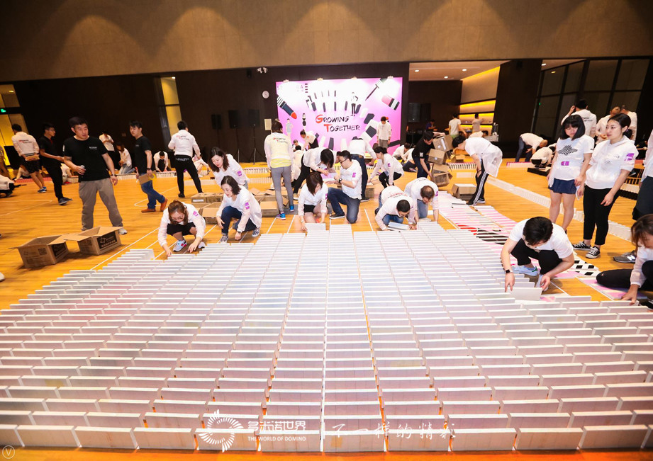 啟動(dòng)的金球順勢(shì)而下,撞擊到第一枚多米諾骨牌,一幅幅多米諾畫(huà)面成功呈現(xiàn),隨著骨牌的前行,隊(duì)員們都紛紛高舉手機(jī),記錄這精彩難忘的一刻,當(dāng)場(chǎng)地中央的巨幅畫(huà)面成功展現(xiàn),“Growing Together”映入大家眼簾,至此,一幅精美的絲芙蘭多米諾畫(huà)卷完全顯露出來(lái)。