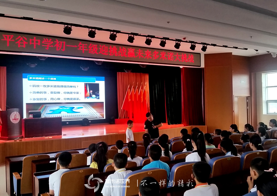 2016年7月14日,平谷中學(xué)初一年級的全體師生,共同迎接多米諾世界的老師來校講座。此次講座旨在于讓同學(xué)們了解、認識、體驗多米諾運動,最終選派團隊參加2016年迎冬奧青少年多米諾創(chuàng)意挑戰(zhàn)賽。