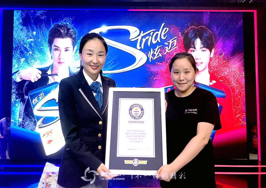 7月15日,一場(chǎng)別開生面的多米諾吉尼斯挑戰(zhàn)活動(dòng)在滬舉辦,現(xiàn)場(chǎng)成功實(shí)現(xiàn)了由7046盒口香糖組成的“長(zhǎng)到根本停不下來”的多米諾,創(chuàng)造了一項(xiàng)“以多米諾形式推倒最多盒裝口香糖”的吉尼斯世界紀(jì)錄。