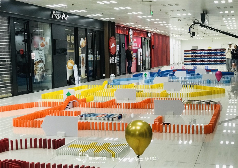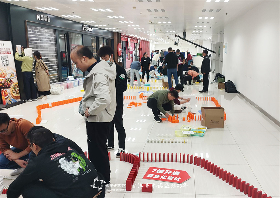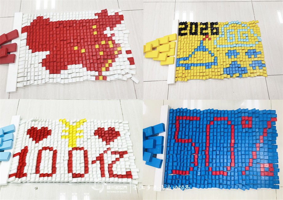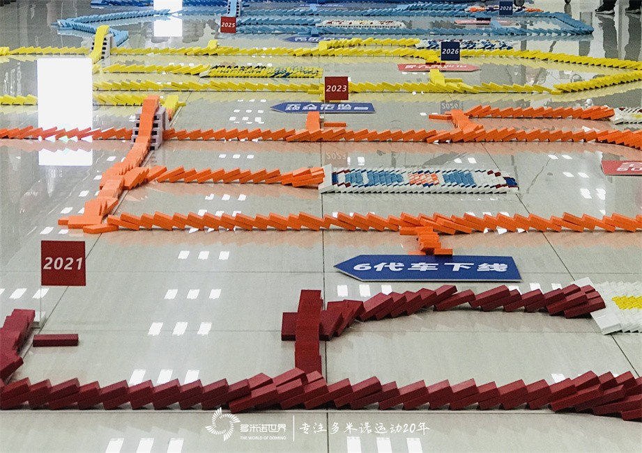 在骨牌搭建的過程中,雖然會(huì)有意外發(fā)生,但是經(jīng)過大家的通力協(xié)作,一幅幅表達(dá)目標(biāo)愿景的畫面一一搭建完成。隨著第一枚多米諾骨牌的觸發(fā),骨牌一路順利前行,一個(gè)個(gè)年代圖卡裝置依次彈開的同時(shí),骨牌畫卷也依次完美呈現(xiàn)。